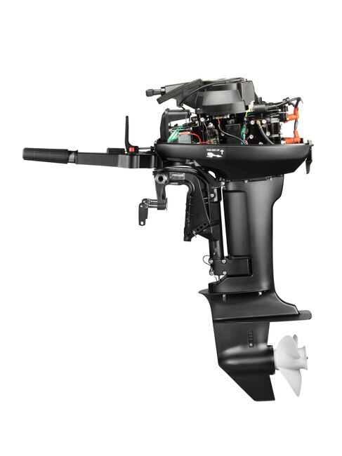 Мотор запускается ручным стартером и управляется стандартным румпелем с поворотной ручкой газа (гашеткой мотоциклетного типа) с антипроскальзывающими насечками.